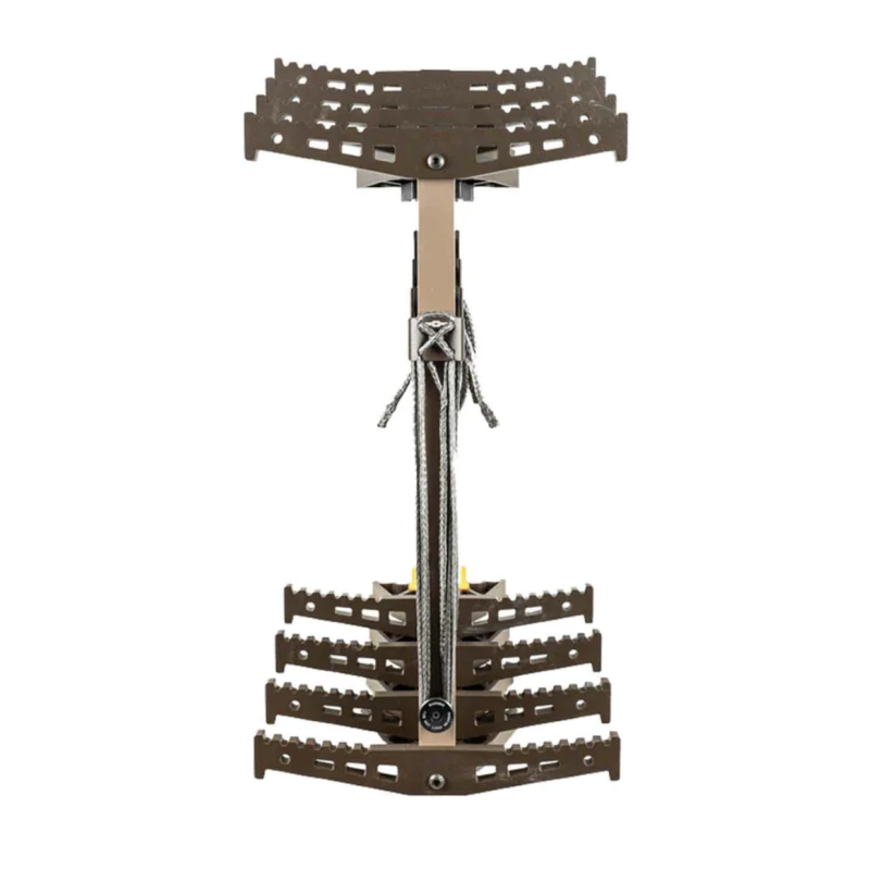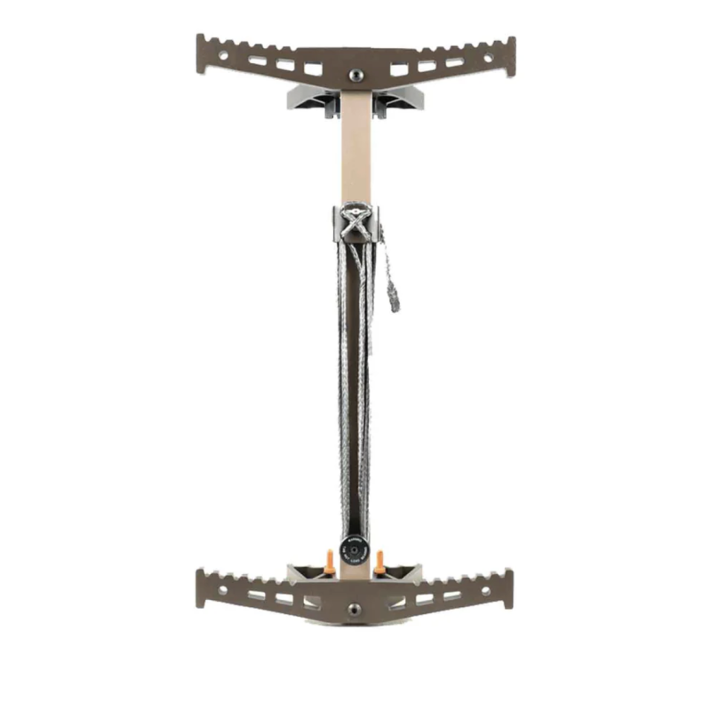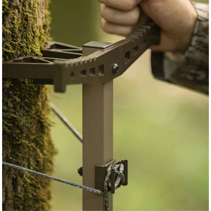 Les bâtons se fixent à l'arbre grâce au système breveté DynaLite de corde et de languette. C'est la méthode de fixation la plus simple, légère, rapide et facile à utiliser en forêt.